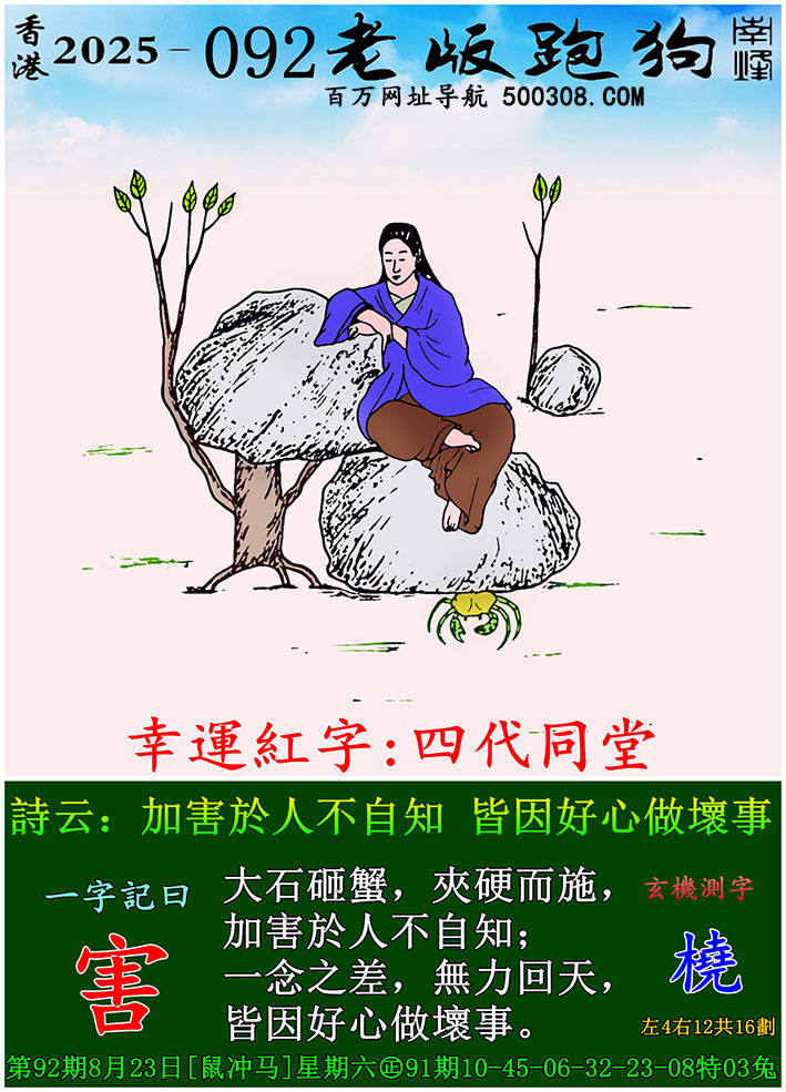 106期跑狗图:一字記之曰: 【覓】 碧波退盡,魚困淺灘。 靜待遊鱗,覓跡求食。玄機測字:《綸》 一語中特:五光十色