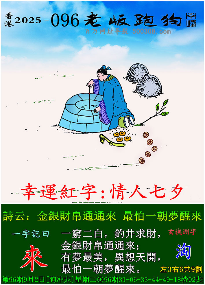 107期跑狗图:一字記之曰:【堆】 晴灘堆沙,小手輕抓。 慾引流泉,疊作尖塔。玄機測字:【墁】 一語中特:三七甘一